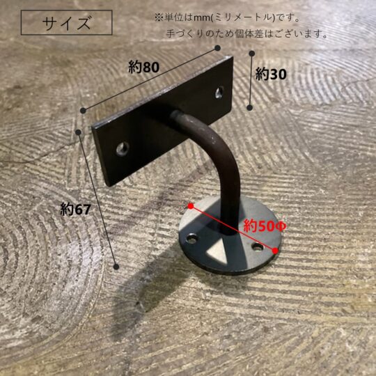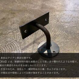 | 注意点 | ・使用状況や環境によっては錆が発生することがあります。 ・手作りの為、溶接ムラ・鋼材特有の小傷・色ムラがあります。 ・手すりの木部は天然木のため、小傷・木目ムラ・節が入る場合がございます。 ・取付については必ず下地のある壁面・天井面へ取付けしてください。 ※木部とブラケットを固定するビスは付属しております。 ※ブラケットと壁面を固定するビスは付属しておりません。取付する壁面に合わせて別途ご用意ください。 |