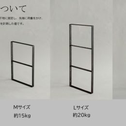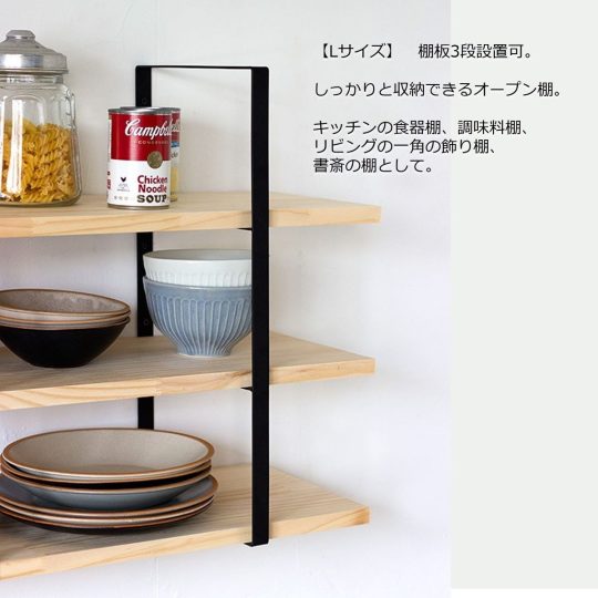 フラットなアイアンバーが格好いいウォールシェルフです。ブラックのアイアンは質量を感じさせる存在感があり、合わせる棚板や家具によってナチュラル・モダン・インダストリアルなど違った雰囲気に。天井・壁・棚板を載せる面それぞれに2箇所ずつビス穴が空いているので、しっかりとシェルフを取り付ける事が可能です。棚板三段を取り付けられるLサイズは、キッチン、洗面所、クローゼット、勉強部屋など様々な場所でご活用ください。