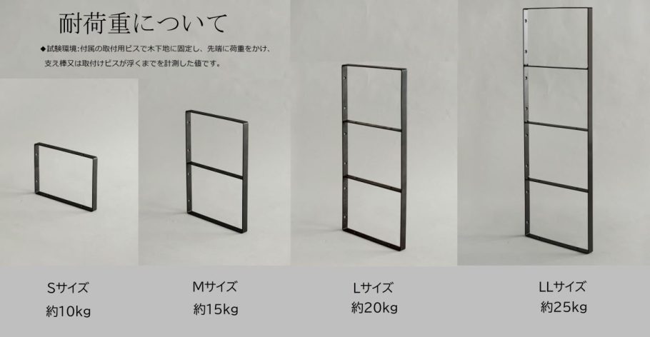 ・試験環境:付属の取付用ビスで木下地に固定し、先端に荷重を  かけ、支え棒又は取付けビスが浮くまでを計測した値です。