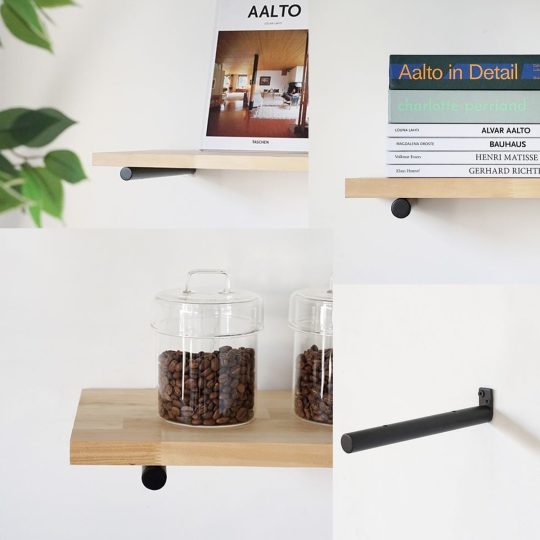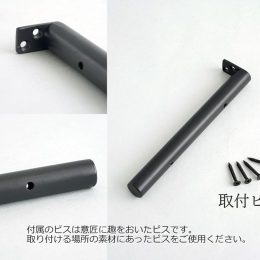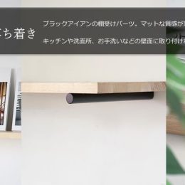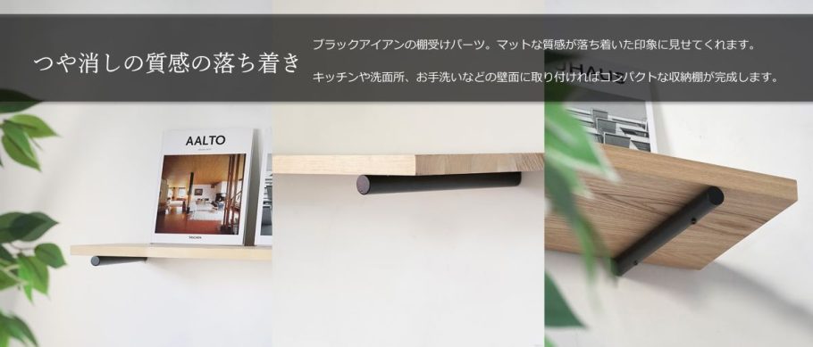 マットなブラックアイアンの棚受けパーツです。壁面にビスで取り付けて、棚板を乗せれば、ウォールシェルフを作る事ができます。