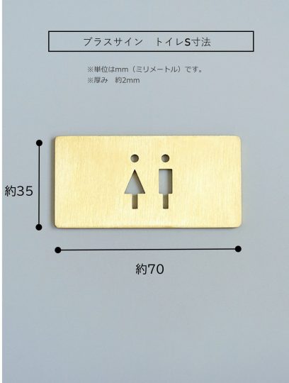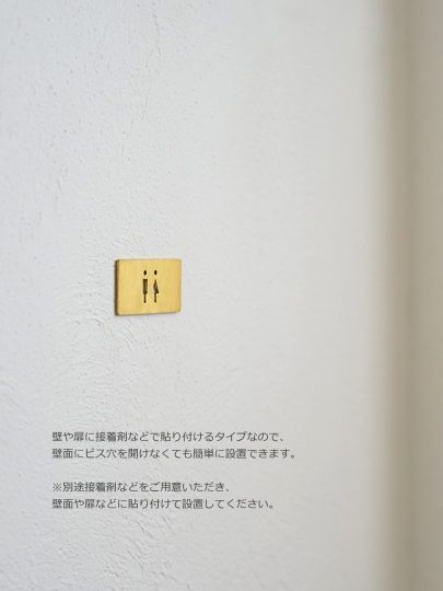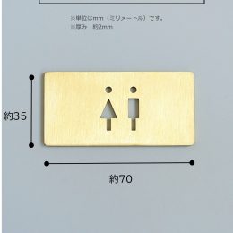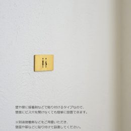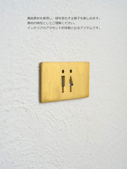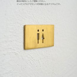 男女のシルエットがくりぬかれた真鍮製のトイレサインです。シンプルなアイコンは視認性に優れていて、店舗やオフィスなどにぴったり。ビス穴の無いタイプなので、接着剤などで壁やドアにしっかりと貼り付けてご使用ください。