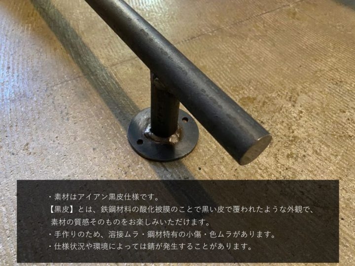 | 注意点 | ・使用状況や環境によっては錆が発生することがあります。 ・手作りの為、溶接ムラ・鋼材特有の小傷・色ムラがあります。 |