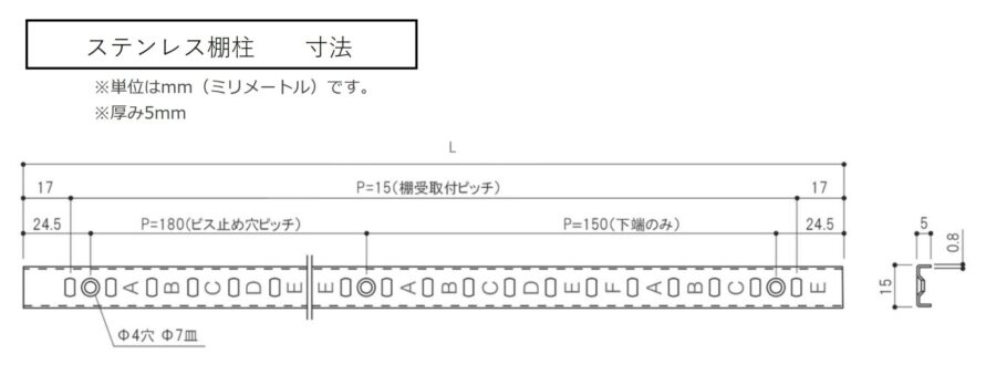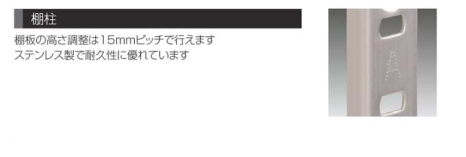 ステンレス製のシンプルなデザインが人気の棚柱です。刻印付きで棚板の高さ調整が簡単な為、用途に応じた棚の設置が可能です。これにより限られたスペースを有効活用し、作業性を向上させることが期待できます。