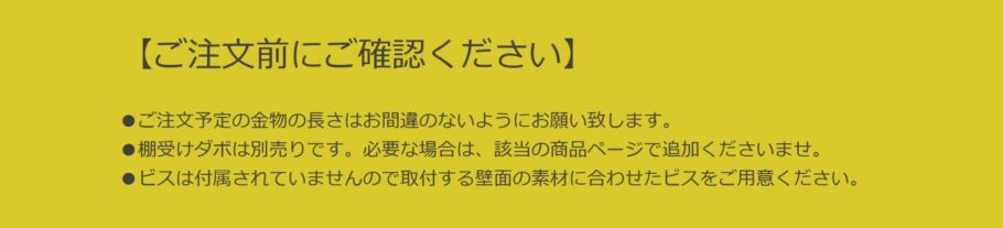 | その他 | ・棚板の高さが15mm間隔で調整できます。 ・棚板1枚あたり安全荷重30㎏/棚板900mm×600mm(以下) ・棚受け材は別途ご用意ください。 ・ビスは付属されておりません。取り付ける壁面に合わせてご用意ください。 |