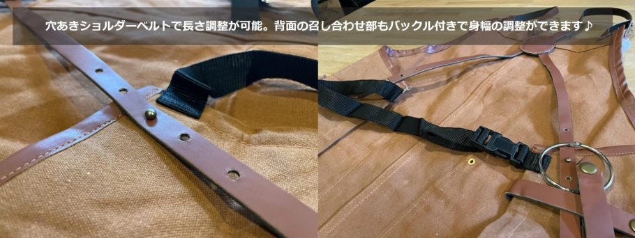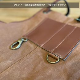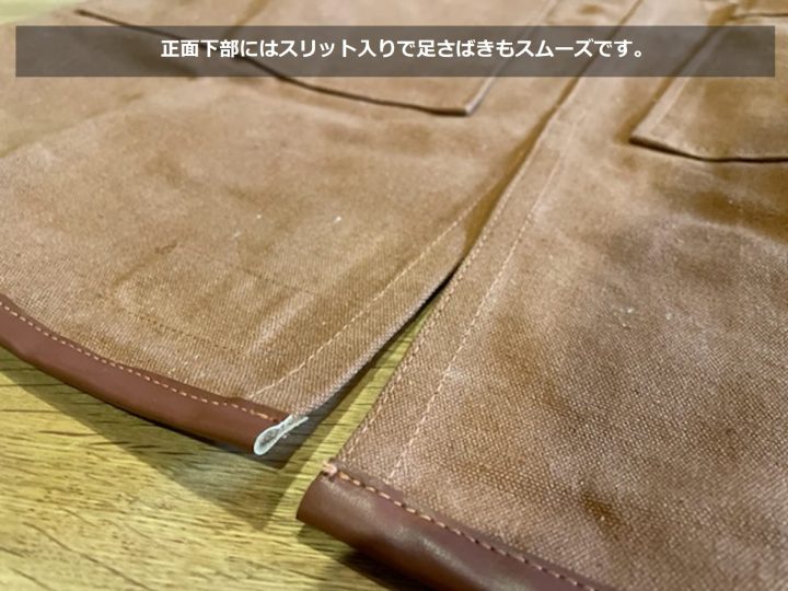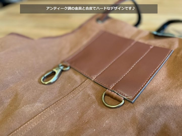 しっかりとしたキャンバス生地の作業用エプロン。多彩なポケットや金具付き。