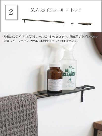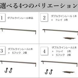 こちらは、ダブルラインレールとトレイのセット品の購入ページです。ダブルラインレール単品やフックのセット品もございます。
