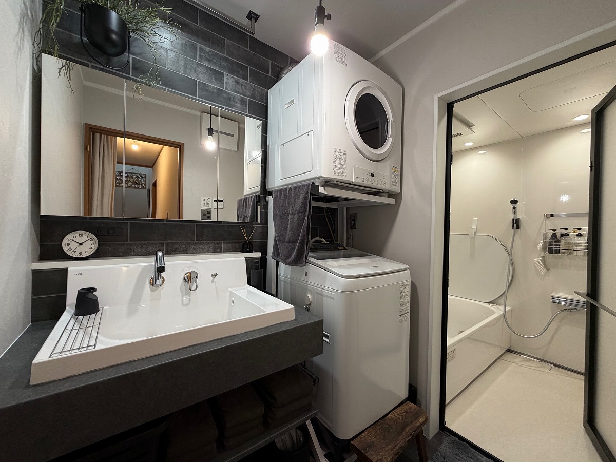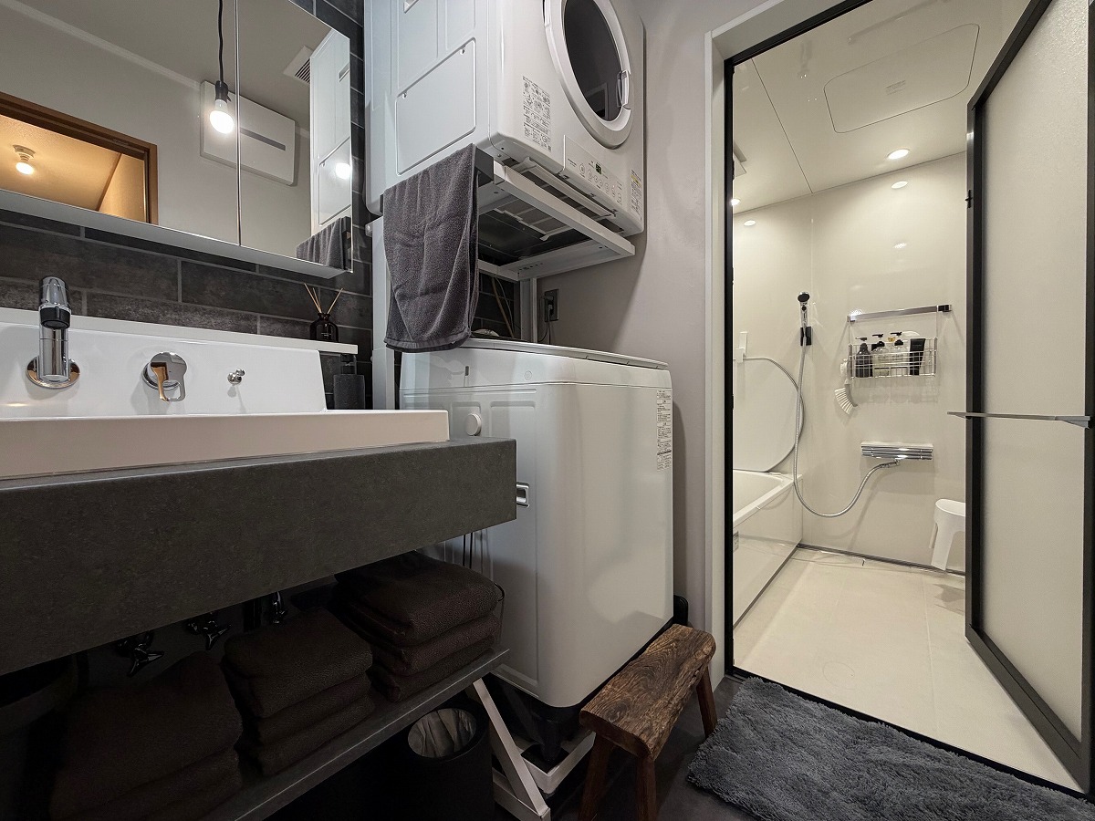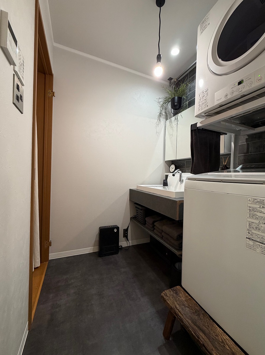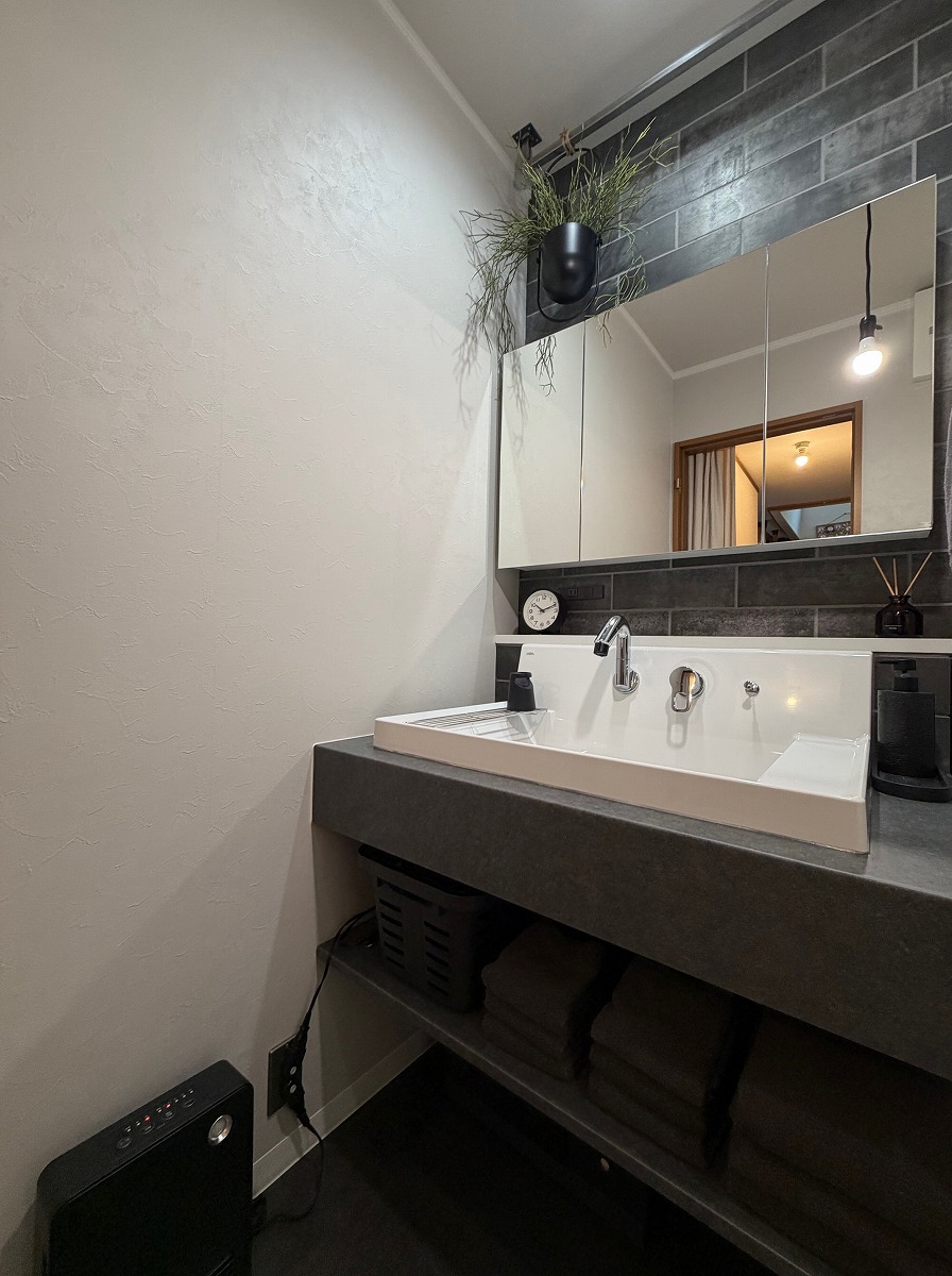 リノベーション,リフォーム相談会にご参加いただき、水回りを中心としたリフォームのお手伝いをさせていただきました。もともとは向かい合わせに配置された洗面台と洗濯機が使いずらい配置でしたので横並びに配置変更をし、お風呂へのアクセスを直線の動線で繋いでいます。洗面カウンターにはLIXLのカスタムバニティ/正面のタイルもLIXLのメタルスタッコⅡ/お風呂はタカラスタンダードのグランスパ(GRANSPA)/おトイレはTOTOのGG-800を採用し、全体的にダークな色合いに統一することでスッキリとしたホテルのような空間に仕上がりました。工事は一旦終わっていますが、引き続きお客様DIYにより既存のドア枠などの塗装をされて一層洗練された空間に変わっていきます。楽しみ♪沢山のお打ち合わせにお付き合いいただきましてありがとうございました。